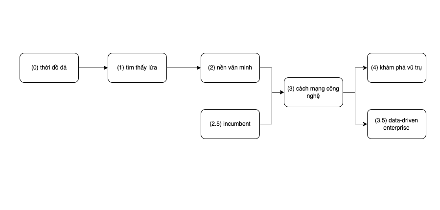 (1) Phát hiện ra lửa: Phải trải qua những khó khăn ban đầu của một doanh nghiệp, và xây dựng ra được những bước đầu tiên của quá trình vận hành. Mô hình doanh nghiệp và quy trình vận hành được định hình, và phải bắt đầu có những doanh thu, có những khách hàng đầu tiên; đó là khởi nguồn để doanh nghiệp bắt đầu thu thập dữ liệu về khách hàng, về kinh doanh, về sản phẩm. Đó là một sự bắt đầu, có sự nhen nhóm về “dữ liệu” ở trong công ty. Không có ai làm “data” cả, nhưng sẽ bắt đầu có một số “phân tích” tự phát; những phân tích này có thể bắt đầu từ bất kỳ ai: có thể là một bạn engineer tò mò, hoặc là một bạn marketing muốn đào sâu hơn vào tệp khách hàng. Những phân tích này thường sẽ chỉ đơn giản nằm trên Excel/Gsheets (hoặc nếu là Engineer, đôi khi là query thẳng từ production system). Các reports, các insights đầu tiên được thực hiện, understanding về business được phát triển thêm, và phân tích hiệu quả bắt đầu trở thành 1 phần của doanh nghiệp. Tuy nhiên, những phân tích này sẽ là một phần của các từng department, như là engineering, marketing hoặc là operation, và thực sự thì chưa có một đội ngũ official nào dành cho Data cả.